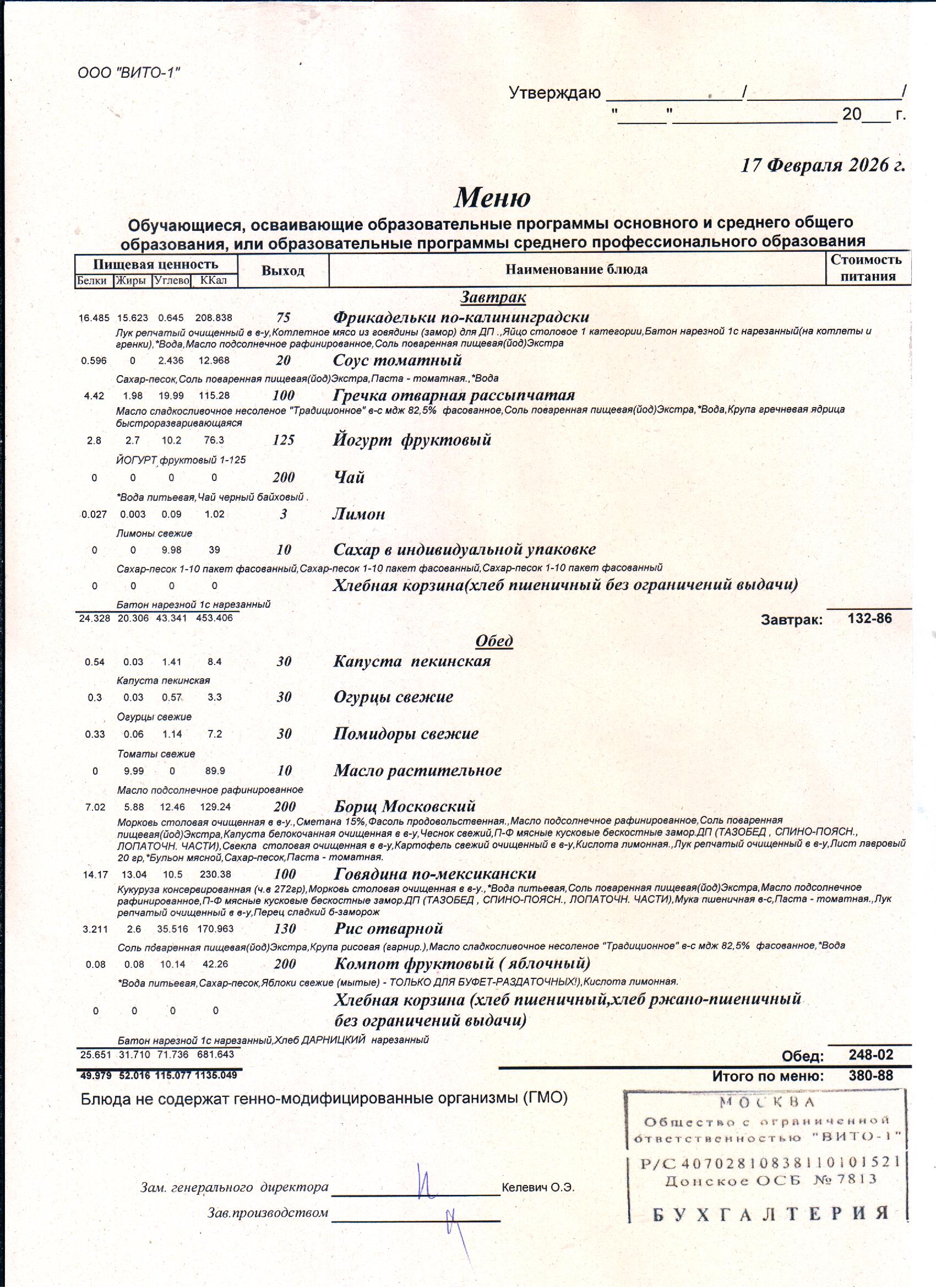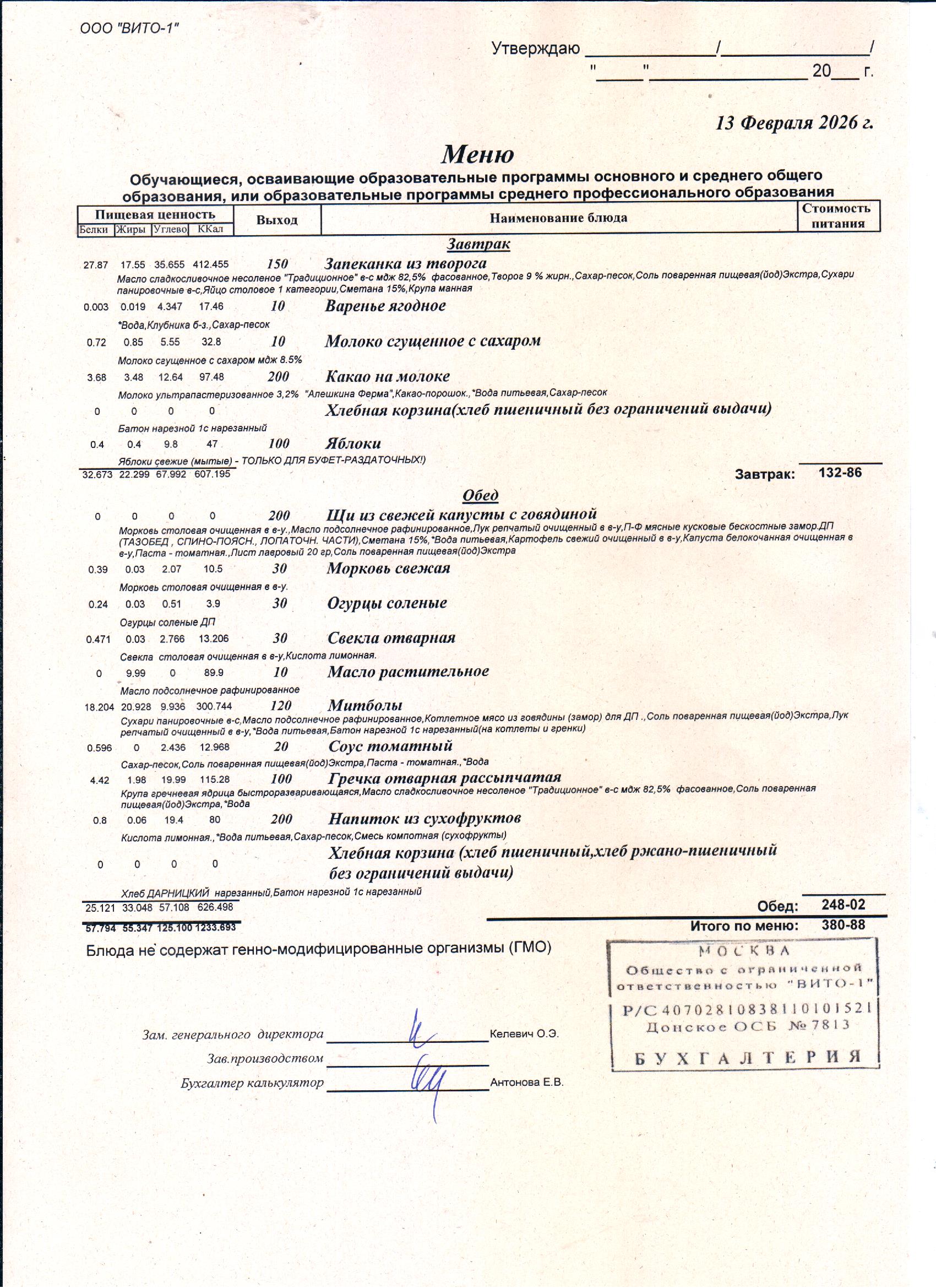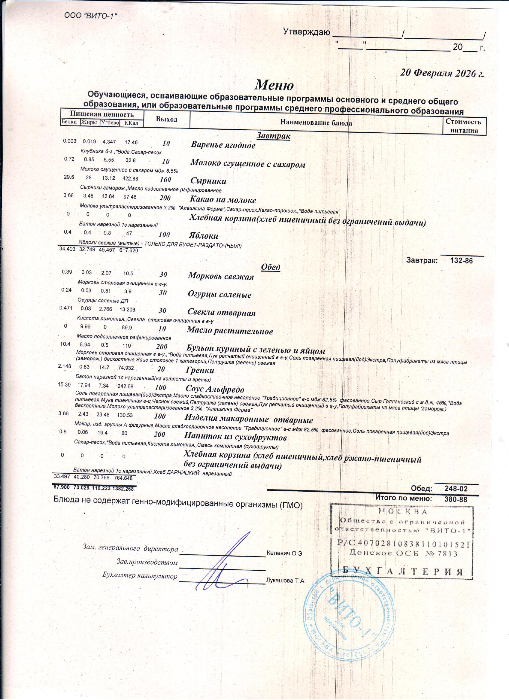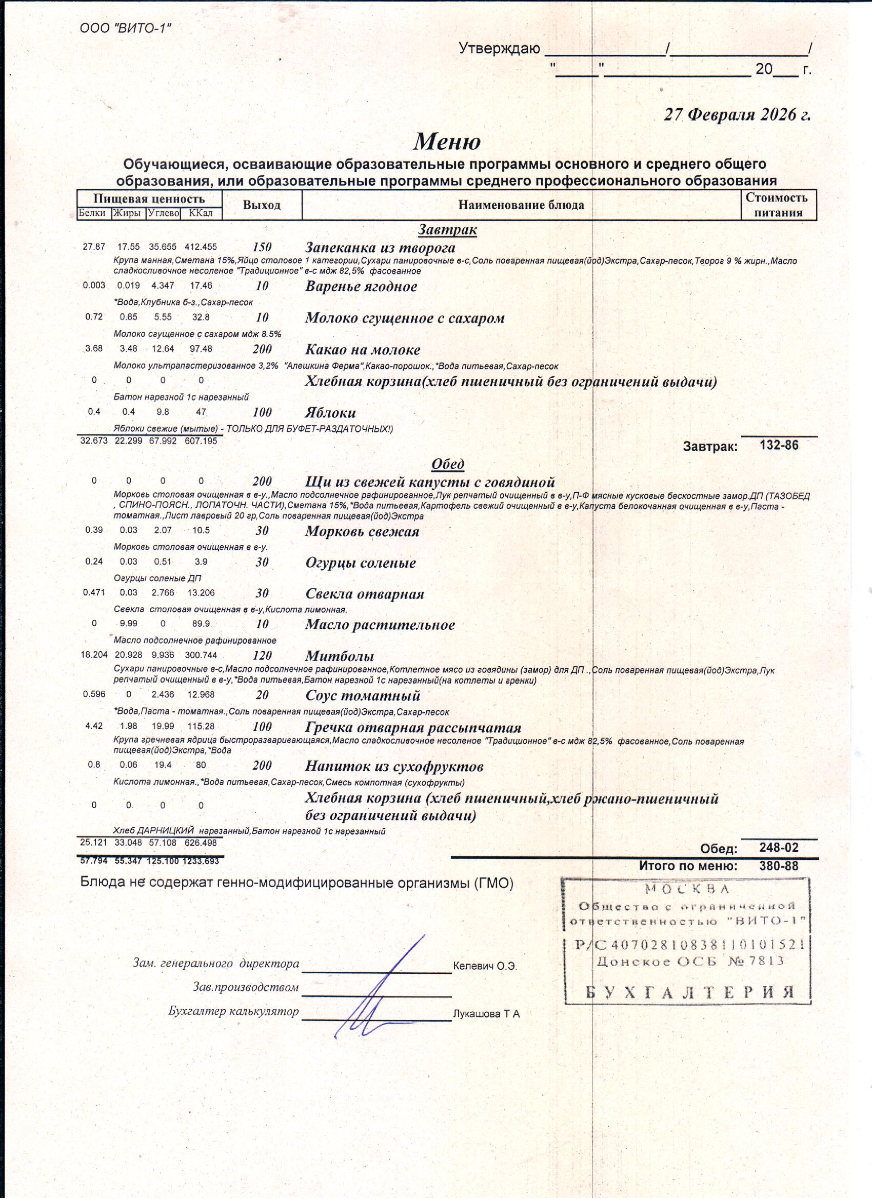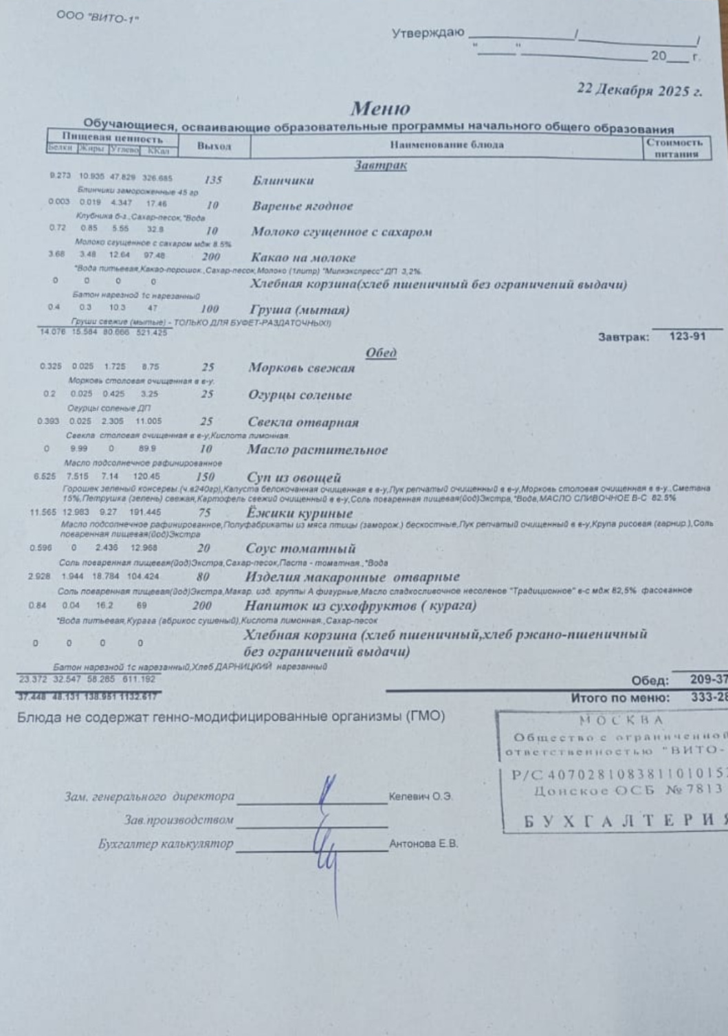 ЕЖЕДНЕВНОЕ МЕНЮ СТОЛОВОЙ