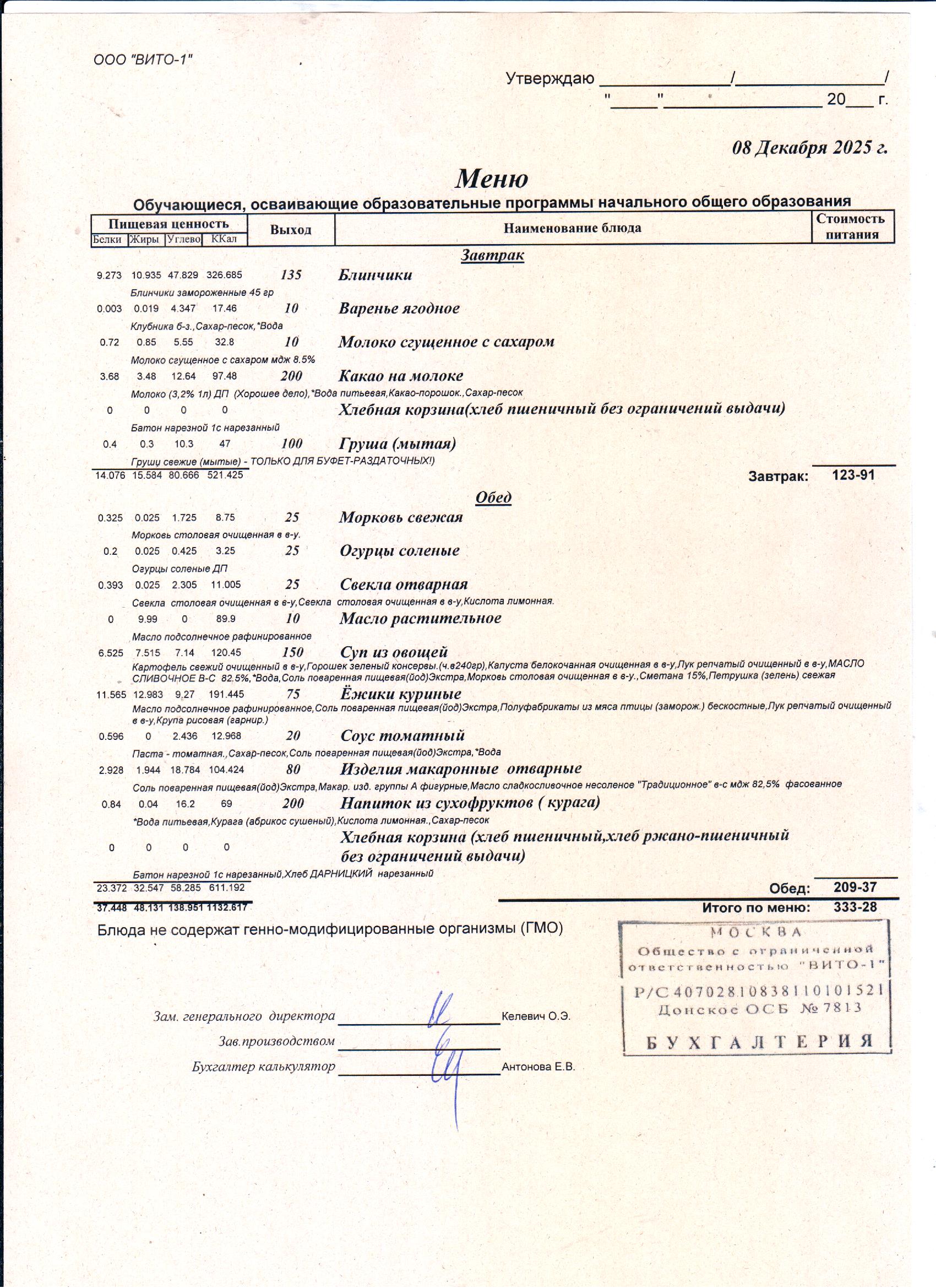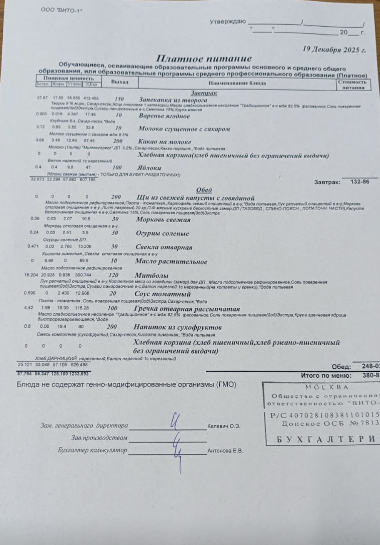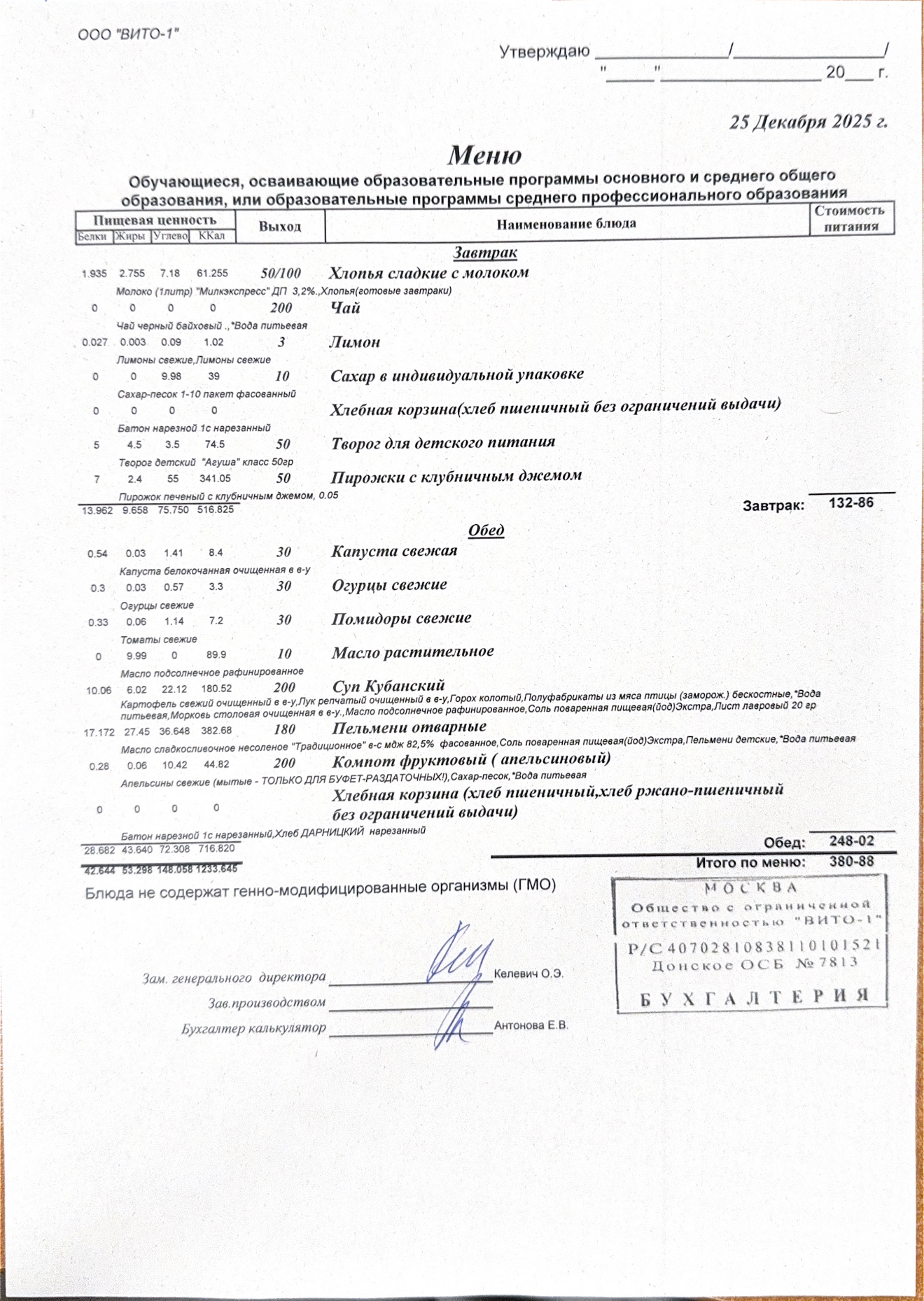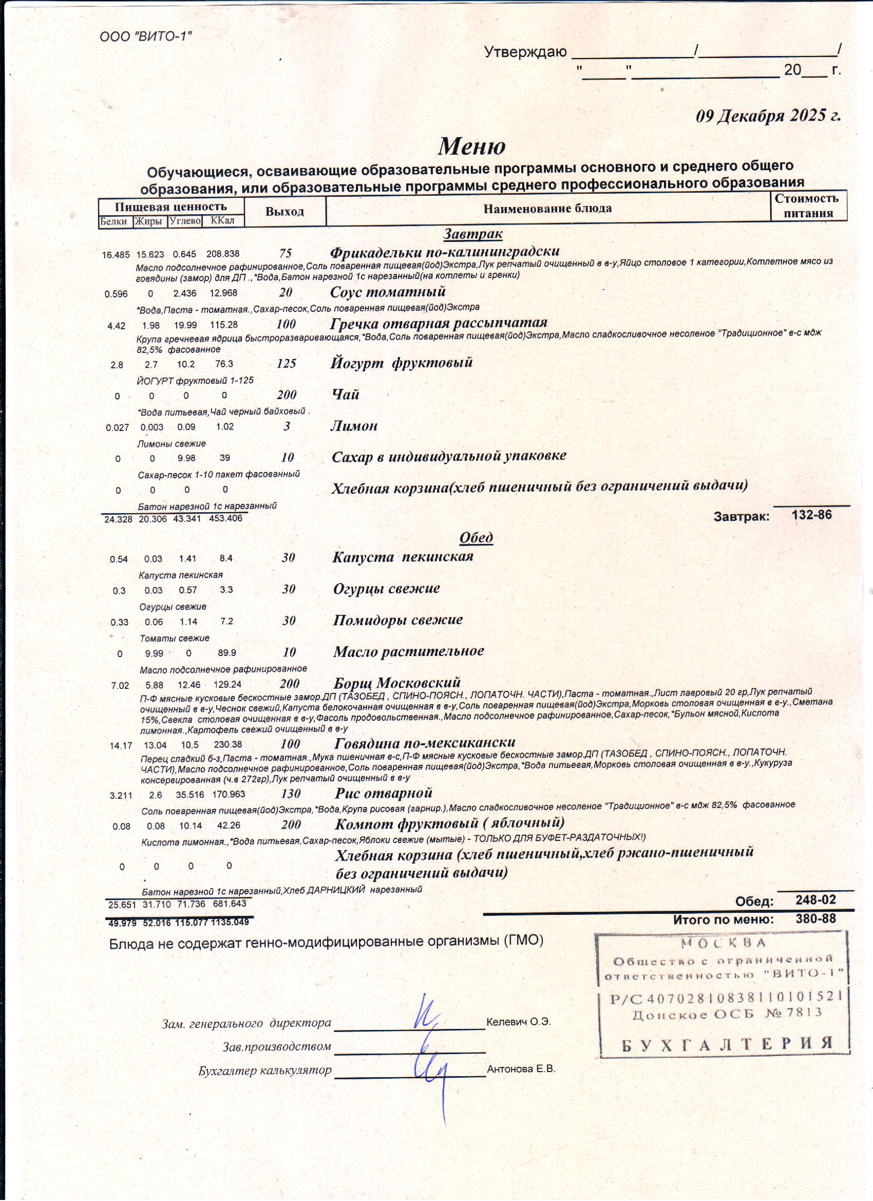 ЕЖЕДНЕВНОЕ МЕНЮ СТОЛОВОЙ